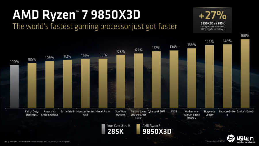 根据AMD提供的数据,与竞争对手Intel Core Ultra 9 285K相比,35款游戏在1080p分辨率的性能平均领先27%。