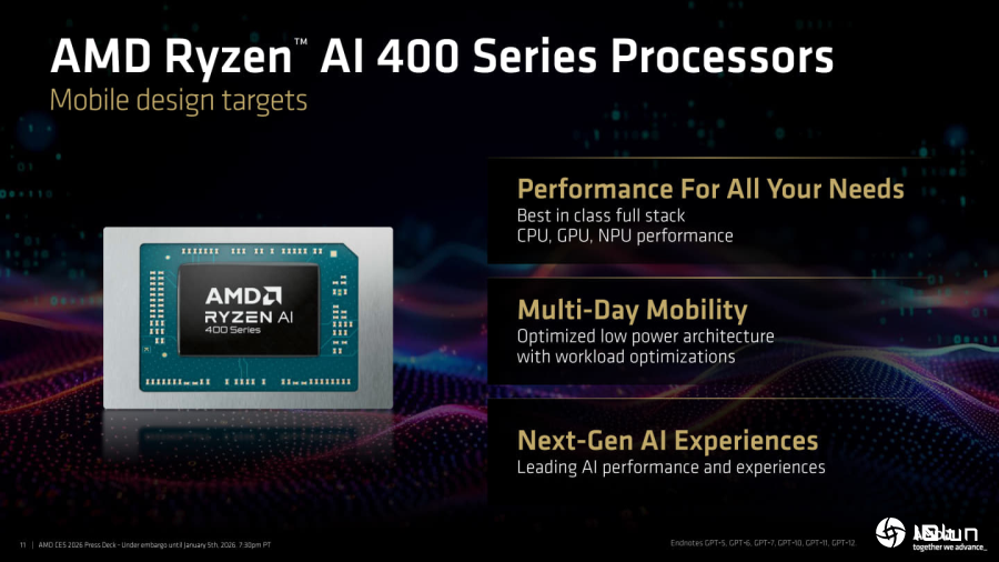 移动版处理器部分,包含小改款的Ryzen AI 400系列,集成CPU、GPU、NPU等运算单元以满足多样使用需求。