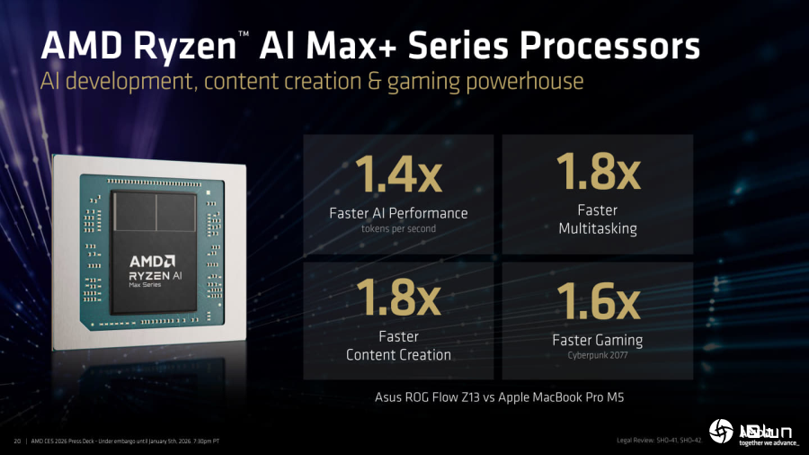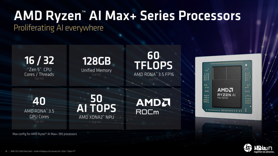 Ryzen AI Max+系列处理器最高配置为16组Zen 5架构核心(32组线程),搭配40组RDNA 3.5架构运算单元(CUs)之内置显示芯片,提供优异的游戏、绘图与AI运算性能。
