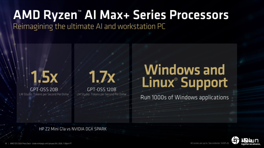 搭载Ryzen AI Max+系列处理器的HP Z2 Mini G1a工作站与NVIDIA DGX Spark相比,执行gpt-oss-120b的单位性能成本领先70%(即相同成本能提供1.7倍性能表现),并支持Windows操作系统。