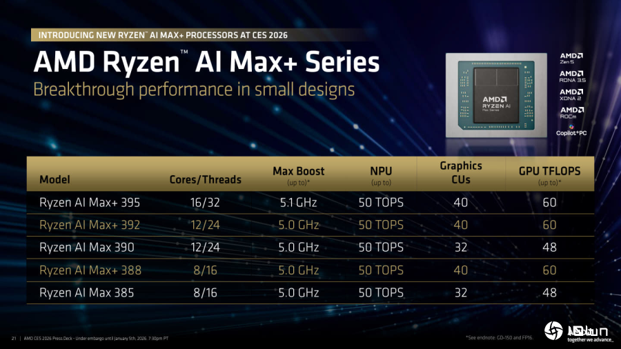 Ryzen AI Max+ 392与Ryzen AI Max 390一样为12核24绪配置,Ryzen AI Max 388则与Ryzen AI Max 385同为8核16绪,不过这次发布的2款新型号同样搭载体有40组运算单元的内置显示芯片,能够带来最高60 TFLPOS的理论运算性能,再搭配具有60 TOPS的NPU,能带来充沛的游戏与AI运算性能。
