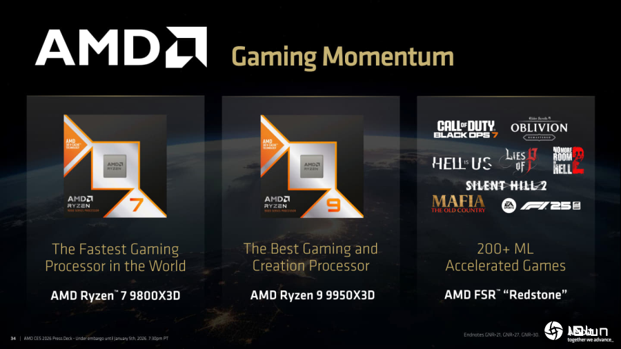 AMD在CES 26拉斯维加斯消费性电子展发布多款桌面与移动版处理器,其中包含强化版的Ryzen 7 9850X3D,能够通过3D V-Cache缓存内存与更高的时脉强化游戏性能表现。