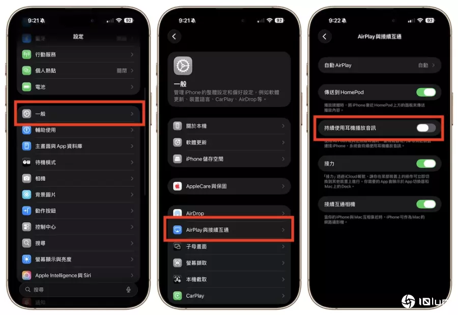 这项新功能默认为关闭,用户可点击“设置”、“一般”、“AirPlay与继续互通”、打开“持续使用耳机音频”。
