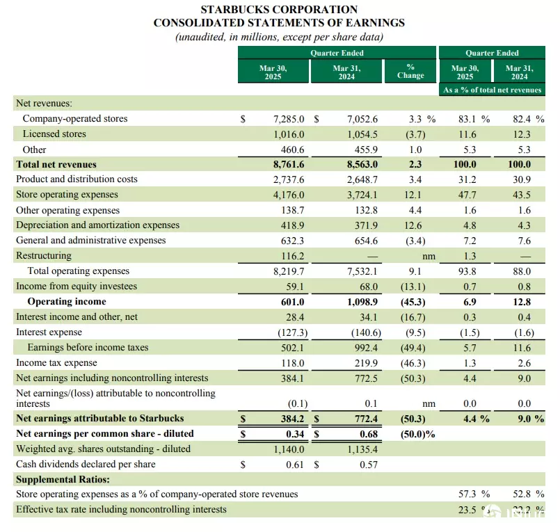 CNBC、巴伦等外媒报道,星巴克于29日美股盘后公布,2025会计年度第二季(截至2025年3月30日为止),营收为87.6亿美元,逊于LSEG统计的分析师预估值88.2亿美元,经调整每股盈余为41美分,逊于分析师预估的49美分。