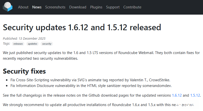 两项漏洞的CVSS风险评分皆为7.2,属于高风险等级,其中CVE-2025-68461属于跨站脚本攻击(XSS)漏洞,问题出在Roundcube处理可缩放矢量图形(SVG)文件的方式。该漏洞由CrowdStrike研究人员Valentin T.发现,攻击者可利用SVG中的 在实际攻击场景中,只要用户于网页邮件界面中打开含有恶意SVG的电子邮件,浏览器便可能立即执行JavaScript恶意脚本。在网页邮件服务中,XSS漏洞的危害尤为严重,常被用来窃取连接阶段Cookie、进行账号劫持,甚至在用户不知情的情况下重定向至钓渔网站。 另一项漏洞则是涉及资讯披露问题,编号为CVE-2025-68460,存在于Roundcube的HTML样式过滤机制中。该漏洞由研究人员somerandomdev通报,攻击者可借此绕过既有的CSS样式过滤规则,可能被滥用来推测或外流网页邮件界面中的数据,进而影响用户的隐私安全。 Roundcube开发团队建议管理员立即升级至1.6.12或1.5.12版,以封堵潜在攻击途径,降低系统遭到入侵或数据外流的风险。 网页邮件服务向来是跨站脚本攻击(XSS)的高风险目标,主因在于其必须在浏览器中动态显示来自外部来源的内容,包括HTML邮件、图片、附件预览与内置样式等。即使系统本身未遭入侵,攻击者仍可通过电子邮件这类“可信输入渠道”,将恶意内容直接送入用户的浏览器环境。