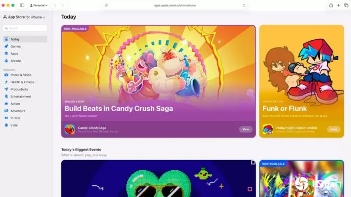 更新后的apps.apple.com网站提供下拉式菜单,让用户切换浏览不同平台的应用程序,包括iPhone、iPad、Mac、Vision Pro、Apple Watch及Apple TV。网站设有“Today”专区,展示每日推荐的应用程序及游戏,也包含Apple Arcade游戏内容及不同类别分类。