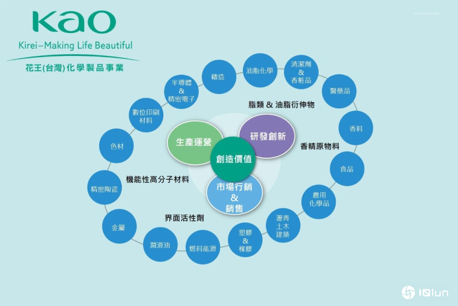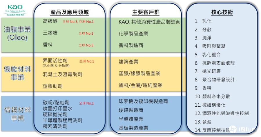 深耕产业需求,花王台湾推进“当地化商品”与“当地制造”目前,花王化学制品业务主要分为三大业务体:油脂业务、情报材料业务以及功能材料业务。其中,油脂业务主要应用户用产品及化学工业领域,情报材料业务则与客户紧密合作,开发高附加价值产品,两项业务都在世界市场占据第一;至于功能材料业务则提供多样化、多功能的界面活性剂,也在亚洲市场站稳龙头宝座。