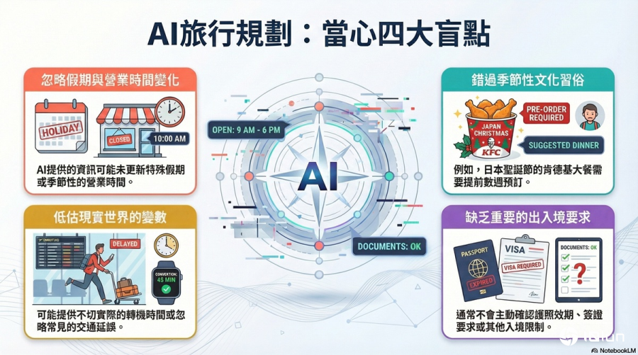 - 现实变量的忽略:AI可能会建议一个没有考虑到达和出发登机口之间距离的航班转机,或提供理想化的驾驶时间,忽略了常见的延误区域。