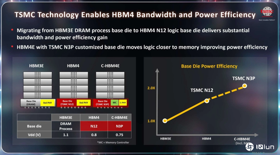 根据台积电官方说法,采用N3P制程的C-HBM4E基础裸晶,其能源效率将大幅提升,预计可达HBM3E基础裸晶的两倍左右。此外,在功耗控制上也有显著进步,C-HBM4E的Vdd电压将仅有0.75V,比HBM4的电压更低,展现出更优异的省电特性。