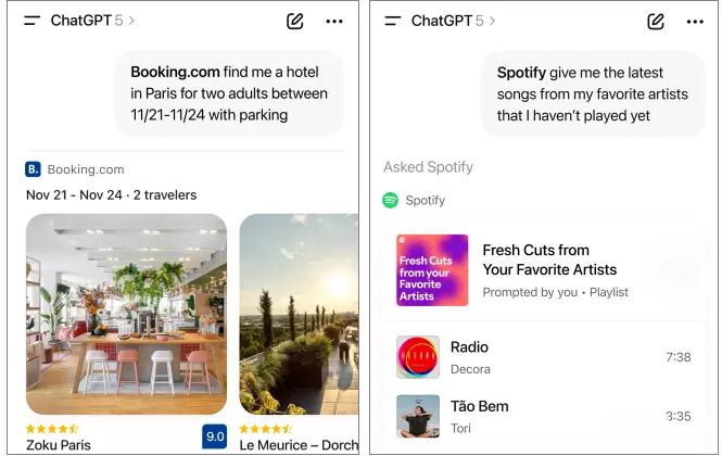 例如直接点名Spotify来创建派对歌单,或是要Booking.com帮你找圣诞节的巴黎住处,请Coursera推荐AI入门课程;当与ChatGPT讨论买房问题时,系统即会建议调用买房应用程序Zillow,需要制作演示文稿时,系统会建议你使用Canva。首次使用各种程序时,ChatGPT会提示连接授权并说明数据分享范围。