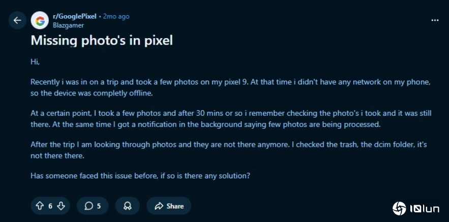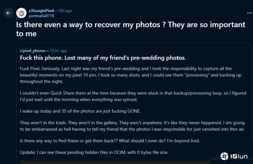 早在几个月前,用户Blazgamer就在Reddit的r/GooglePixel子版块发文指出,他用Pixel 9在旅行途中拍摄的照片全部不见了。就在今天稍早,另一位用户portmafia9719也说他的Pixel 10 Pro遇到了类似的问题。目前还不清楚这些照片到底发生了什么事,但公用点似乎是,手机曾长时间跳出“照片正在背景处理”的通知,之后照片就不见踪影了。