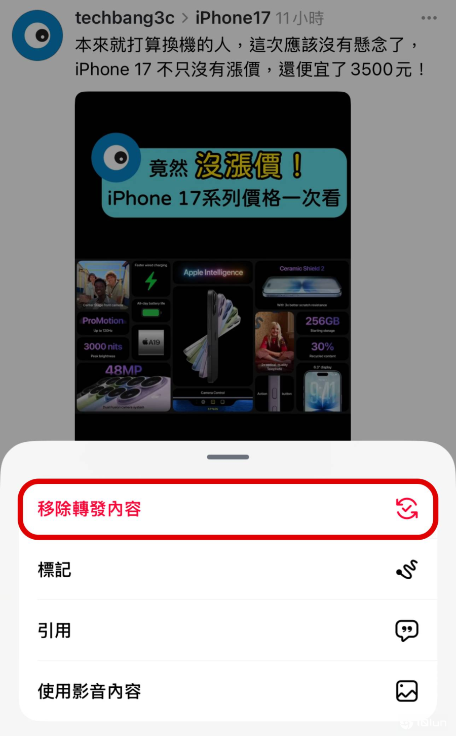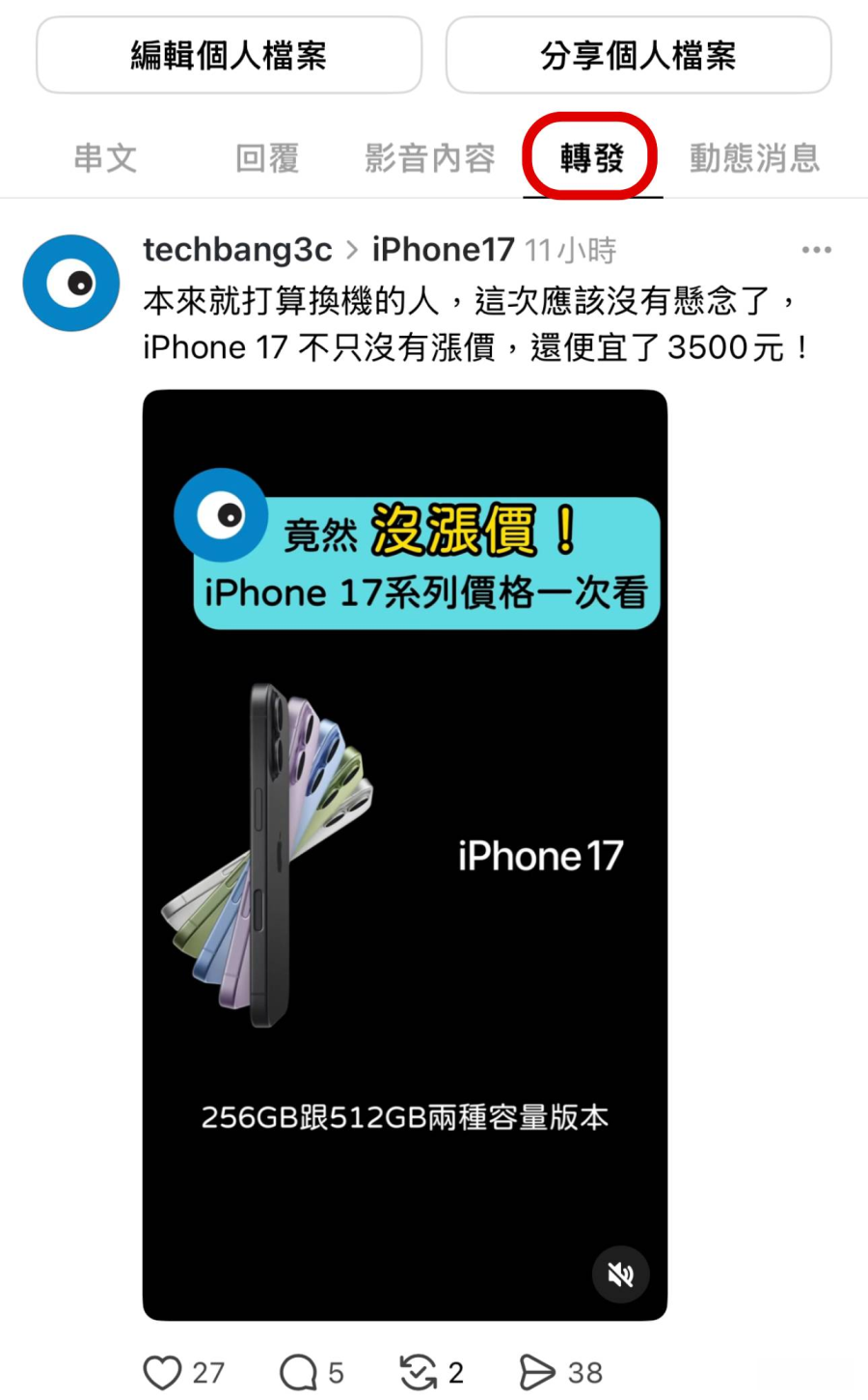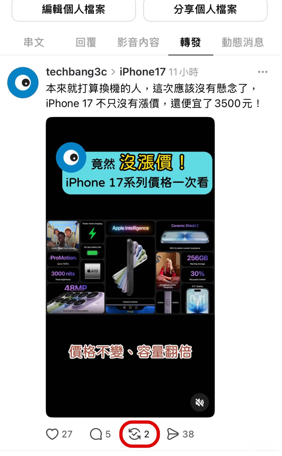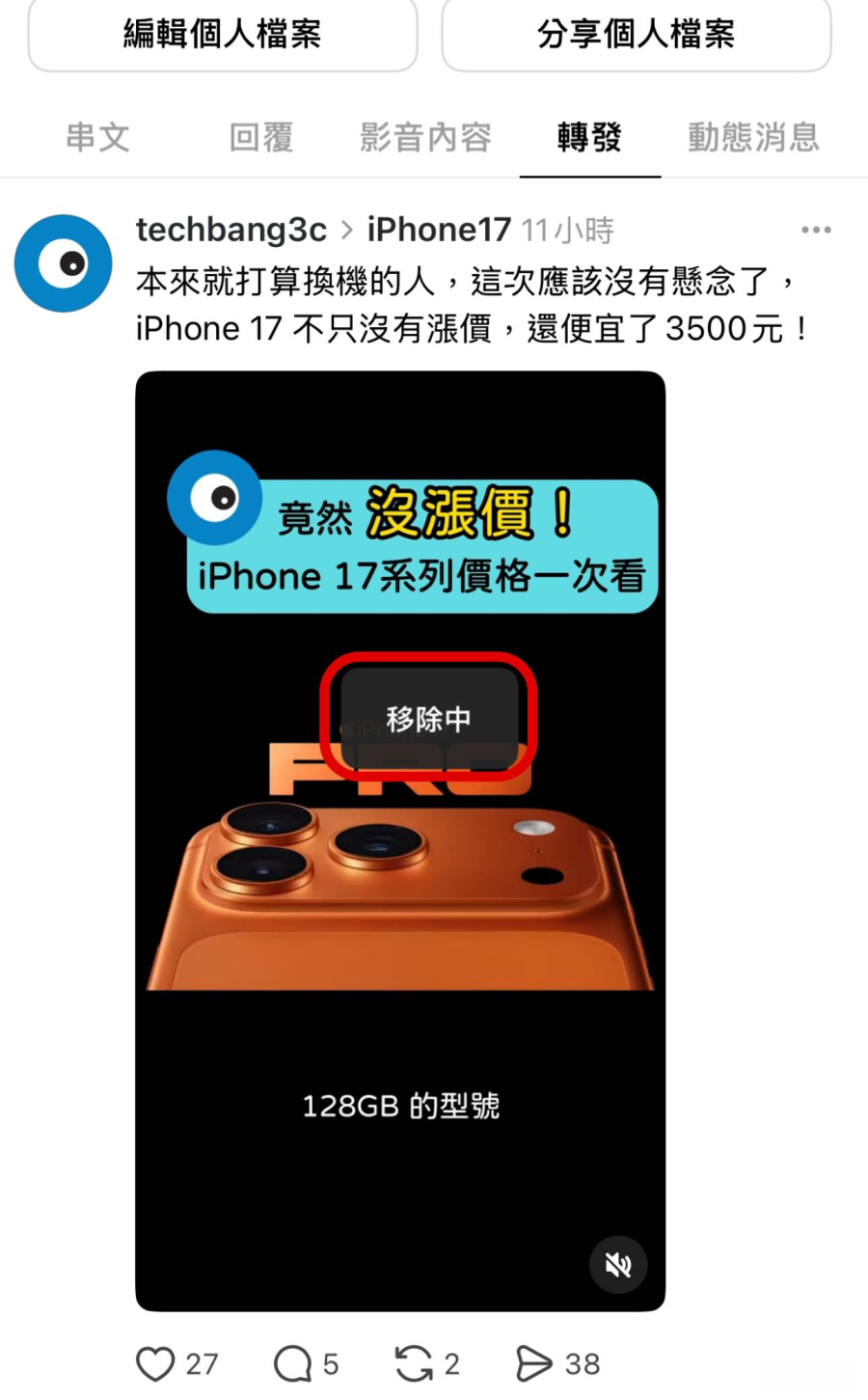 Threads nightclub 2025-12-07 16:29:57 Threads贴文转萌生想法收回不是按删除,“移除转发内容”才是正解 在Threads上,“转发”功能除了能让用户快速分享有共鸣的贴文,有些人也会用来宣传或回顾自己的旧文。不过,有时候可能转发错了,或是想要改成“引用”,这时直觉上会想用“删除”功能。但一删才发现,不只转发的贴文消失了,连自己的原文也被一并删除了。以下教你如何正确地取消转发,而不会误删原文。 评论 收藏 分享 微信扫一扫:分享 微信点“扫一扫” 点右上“...”,便可分享本文