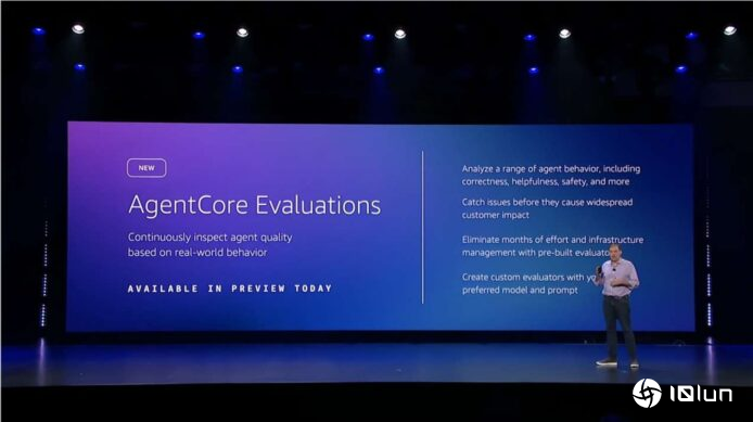 AgentCore Evaluations协助开发者持续检查基于真实行为Agent品质。提供13个预览评估器,覆盖常见品质维度;支持创建自订评分系统;在测试阶段评估Agent,在部署前纠正问题;在生产环境中快速发现品质下降。结果显示在CloudWatch中,自动化专业知识和基础设施繁重工作,让所有人都能访问并持续改良Agent品质。
