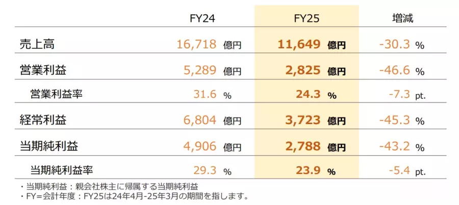 任天堂8日于日股盘后公布财报新闻稿指出,因Switch游戏机、游戏软件销售萎缩,拖累上年度(2024年度、2024年4月-2025年3月)总营收年减30.3%至1兆1,649亿日元、整合营业利润暴减46.6%至2,825亿日元、整合纯利润暴减43.2%至2,788亿日元。