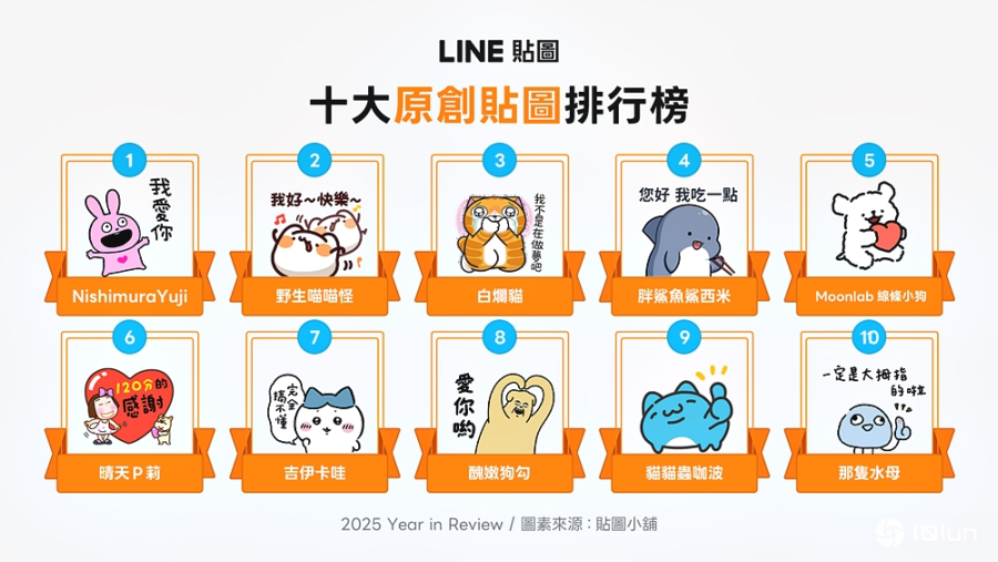 LINE公布2025年度贴图榜单,今年角色类型更多样,从吉伊卡哇到各种社交媒体话题角色,都因贴图互动方式丰富,成为聊天室常见素材,其中由Nishimura Yuji创作的LOVE RABBIT - 恋爱兔 - 与Nagano的吉伊卡哇,同时出现在“十大原创贴图”与“五大原创表情贴”榜单,恋爱兔更拿下“五大原创主题”第一名,两者之所以受到欢迎,与创作者持续更新作品、社交媒体讨论热度高、贴近生活的中文翻译,以及能在聊天中立即使用的贴图互动设计有关,今年首次挤进前十名的丑嫩狗勾与那只水母,也因内容直觉、有创意,受到年轻用户青睐而快速窜红。