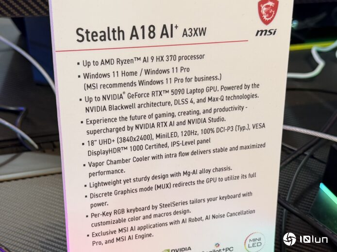 图为MSI Stealth A18 AI+ 及其配置
