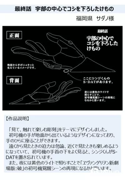 评审对“初号机手掌”雕像方案给出高度评价。他们指出这项作品能让人直接感受到《新世纪福利战士》的世界观,设计简洁明快,无论是否熟悉原作都能一眼明白背后概念。雕像鼓励观众不只是用眼睛欣赏,更可以通过触摸或坐下等方式亲身体验乐趣。评审也认为“手”在整个福利战士系列里意义重大,不只是象征性的角色元素,更是代表人与人联系的隐喻。