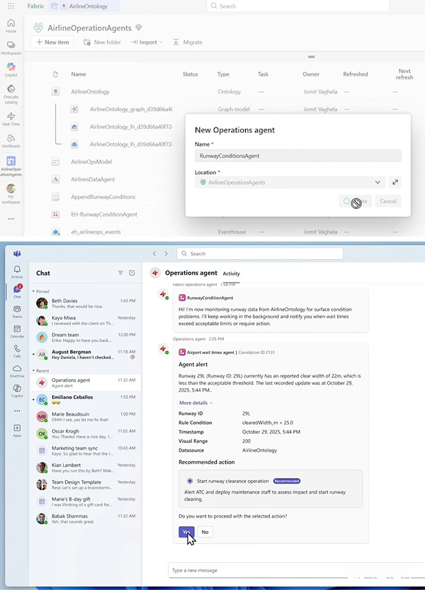 Operations Agent则是此次最重要新功能,该代理会持续监看本体模型中的各种实体与事件,根据企业设置的政策与目标推理场景,评估风险与取舍,并对接运营系统采取动作。Operations Agent是具有决策能力的代理,而非警示或流程自动化工具,能够依据实际结果调整后续行为,但企业仍可决定自动执行和需要核准的场景。