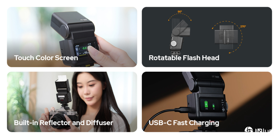 Godox iT32闪光灯体积仅约56 x 39 x 101mm、重量约169克,极致轻巧。它具备约GN18的闪光指数(ISO 100,米),在全功率输出下的回电时间仅需约1.5秒,充满电后可连续击发约510次全功率闪光。设计上,iT32配备了直觉的触摸屏幕,让参数调整更便捷。闪光灯头支持270度水平回转与90度垂直俯仰,方便进行跳灯作业。此外,闪光灯更内置了反射板、柔光片与LED造型灯,满足基础的布光需求。