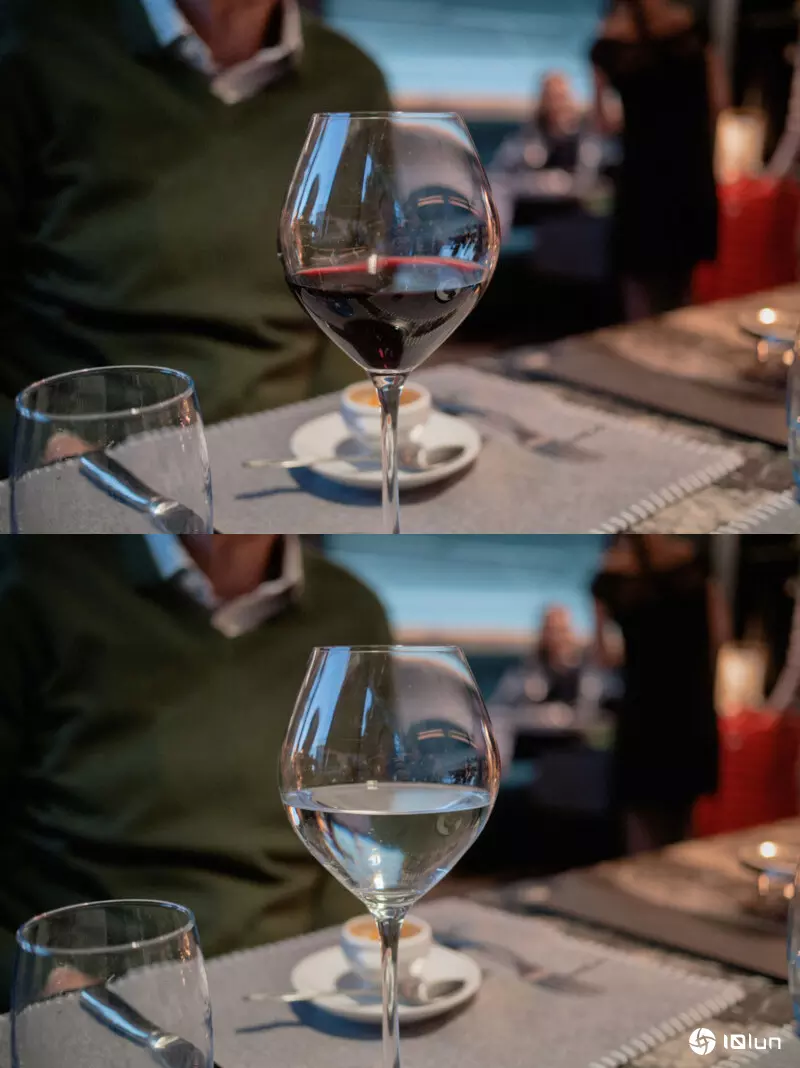 上图:使用Caira拍摄的原始照片/下图:通过Nano Banana编辑改变酒杯里的内容。