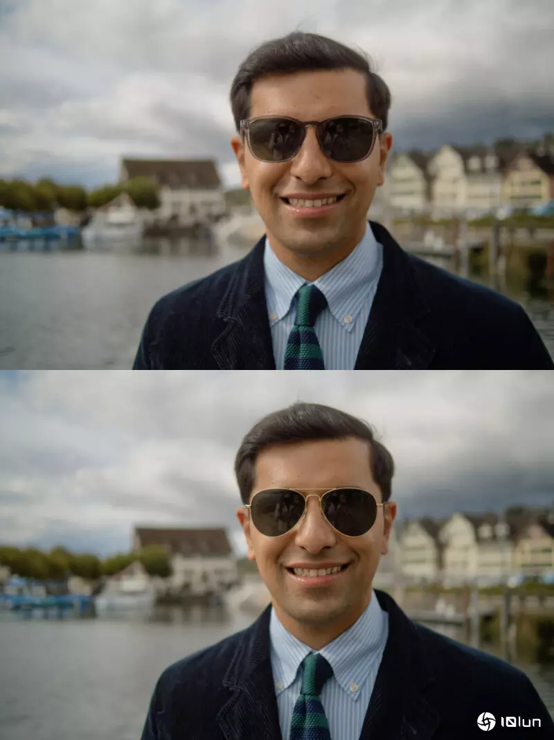 上图:使用Caira拍摄的原始照片/下图:通过Nano Banana编辑将眼镜换成不同款式。