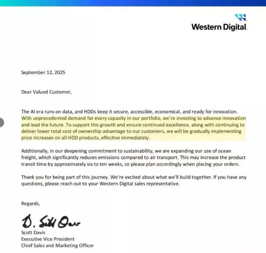 根据属名西部数据执行副总裁销售首席营销官Scott Davis发给客户的信件表示,AI时代以数据为基础,而HDD让数据保持安全、可访问、经济实惠,并为创新做好准备。
