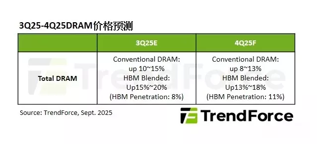 TrendForce(集邦科技)最新报告指出,由于三星、SK海力士、美光三大DRAM原厂将资源优先投入服务器与HBM内存的生产,预估2025年第四季,传统DRAM价格还会再涨8~13%,如果将HBM内存一起计算,总体价格可能涨幅来到13~18%。